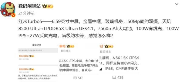 与此同时,REDMI Turbo 5将搭载一块6.59英寸的中屏,采用金属中框与玻璃机身的组合,提升整机的质感,增强了机身的坚固性和耐用性,配备5000万像素简约双摄,内置LPDDR5X Ultra内存和UFS4.1闪存。